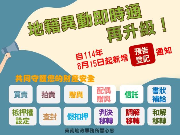內政部為強化防範高風險不動產詐騙案件,使民眾能及早因應維護其權益,自114年8月15日起再擴增「地籍異動即時通」服務範圍,新增「預告登記」為適用之登記原因。